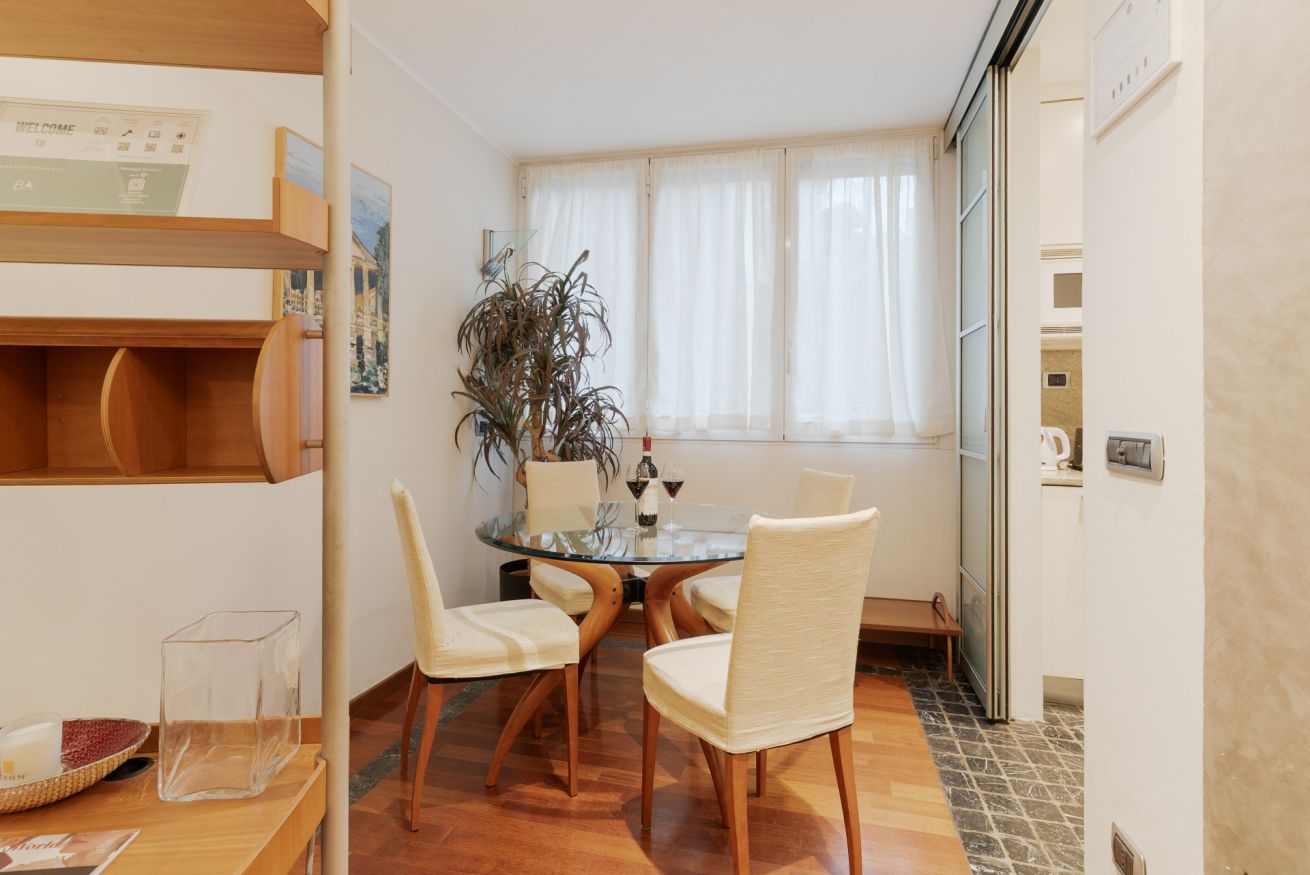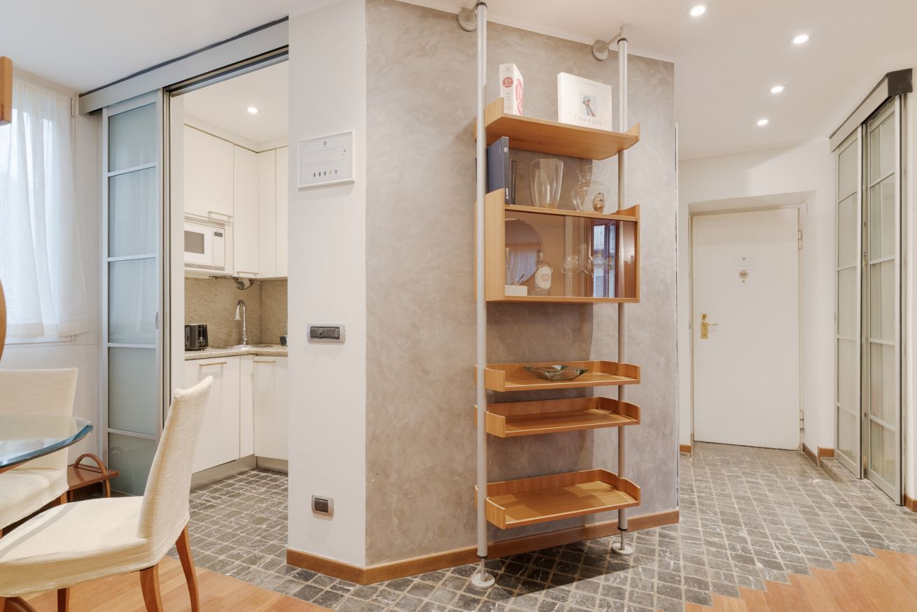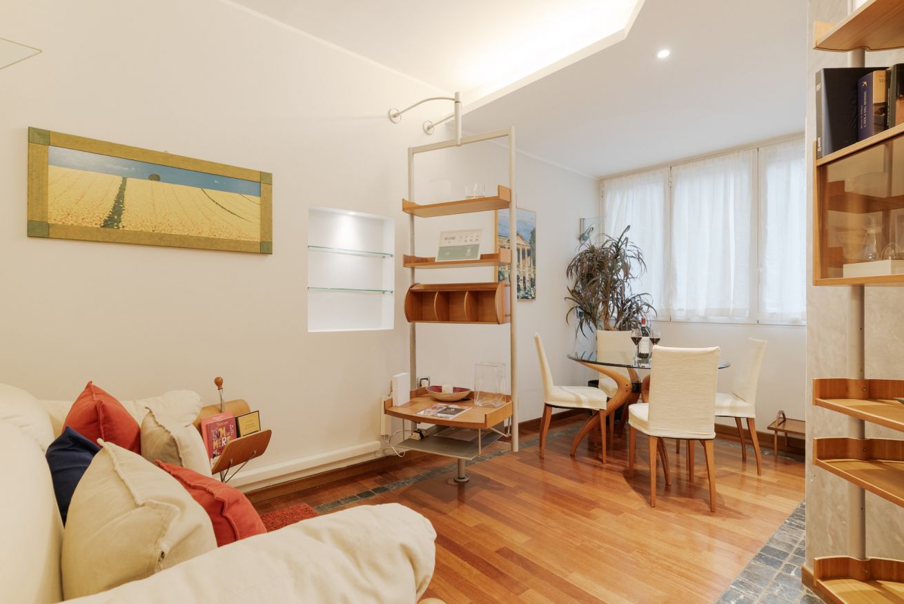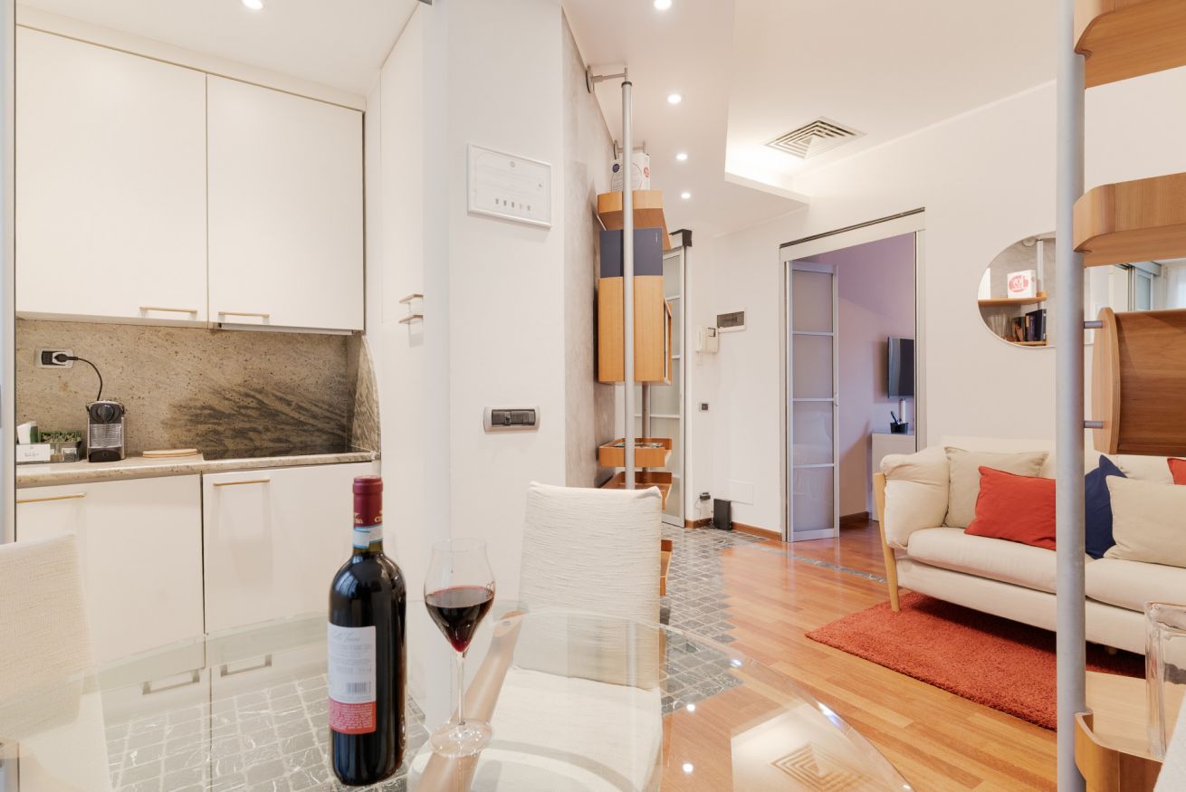 L’appartamento offre un soggiorno con cucina a vista e una camera da letto con balconcino, ideale per un momento di relax nel cuore della città.