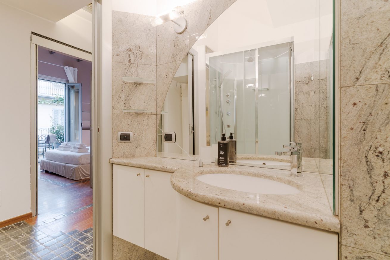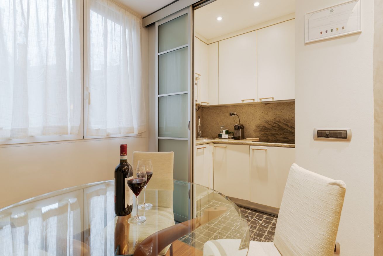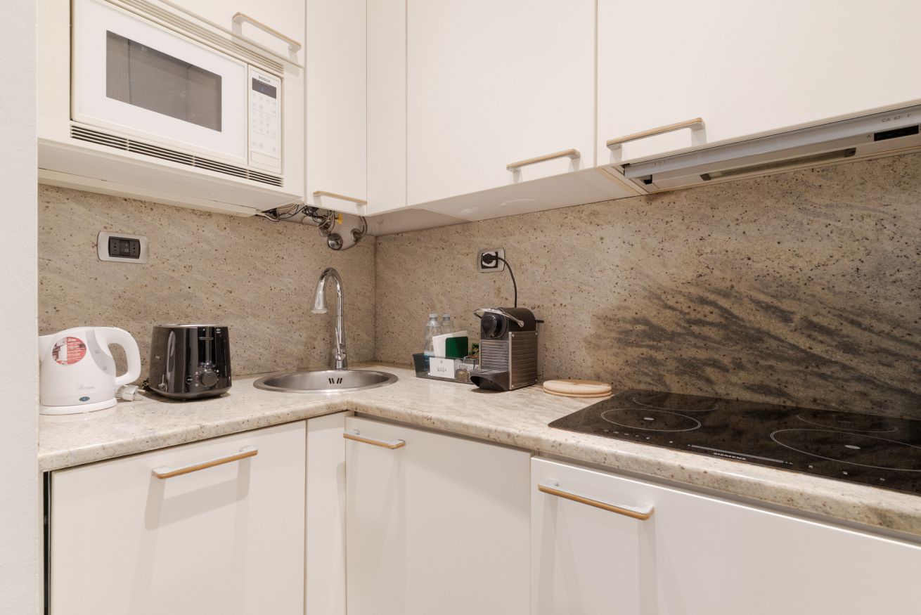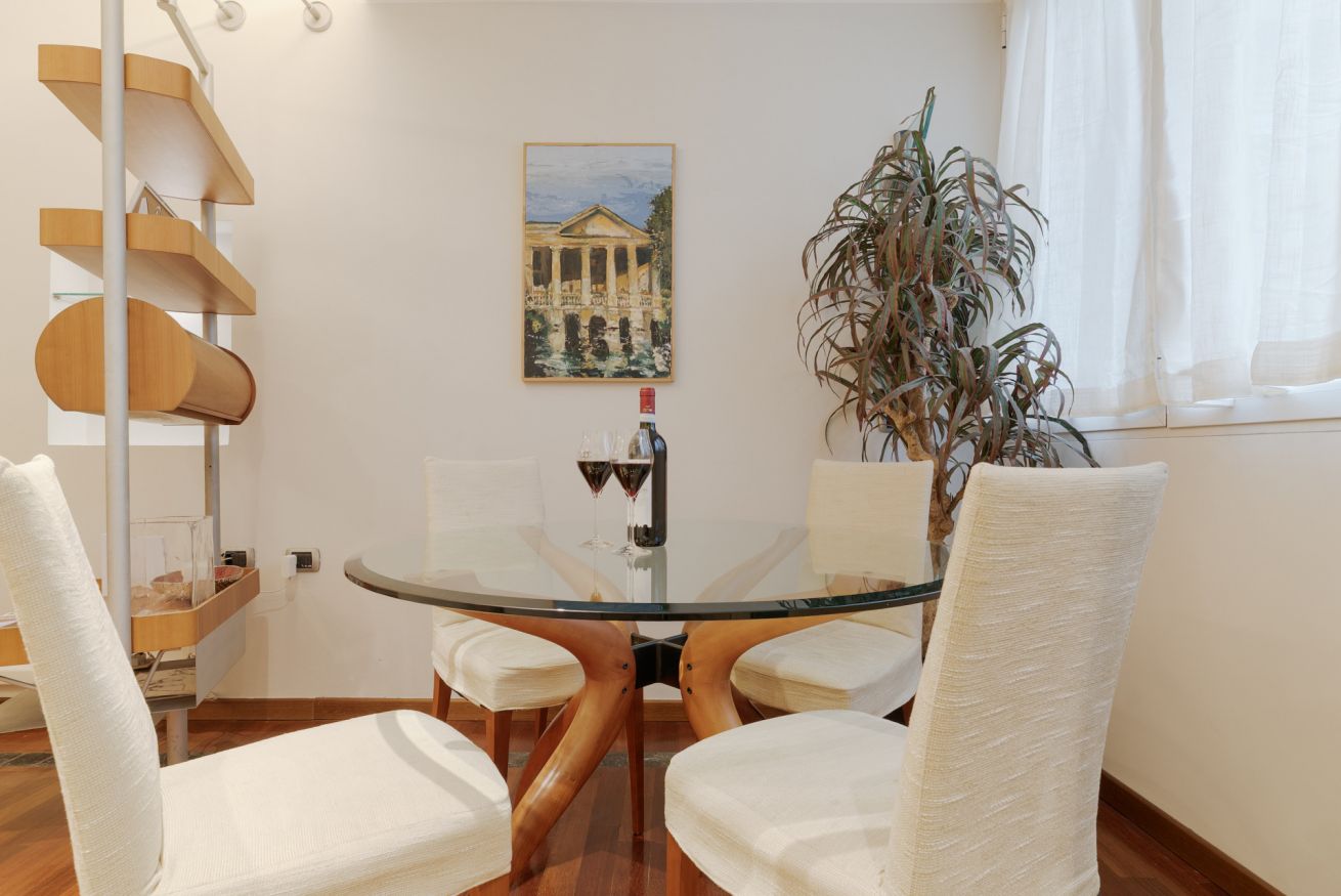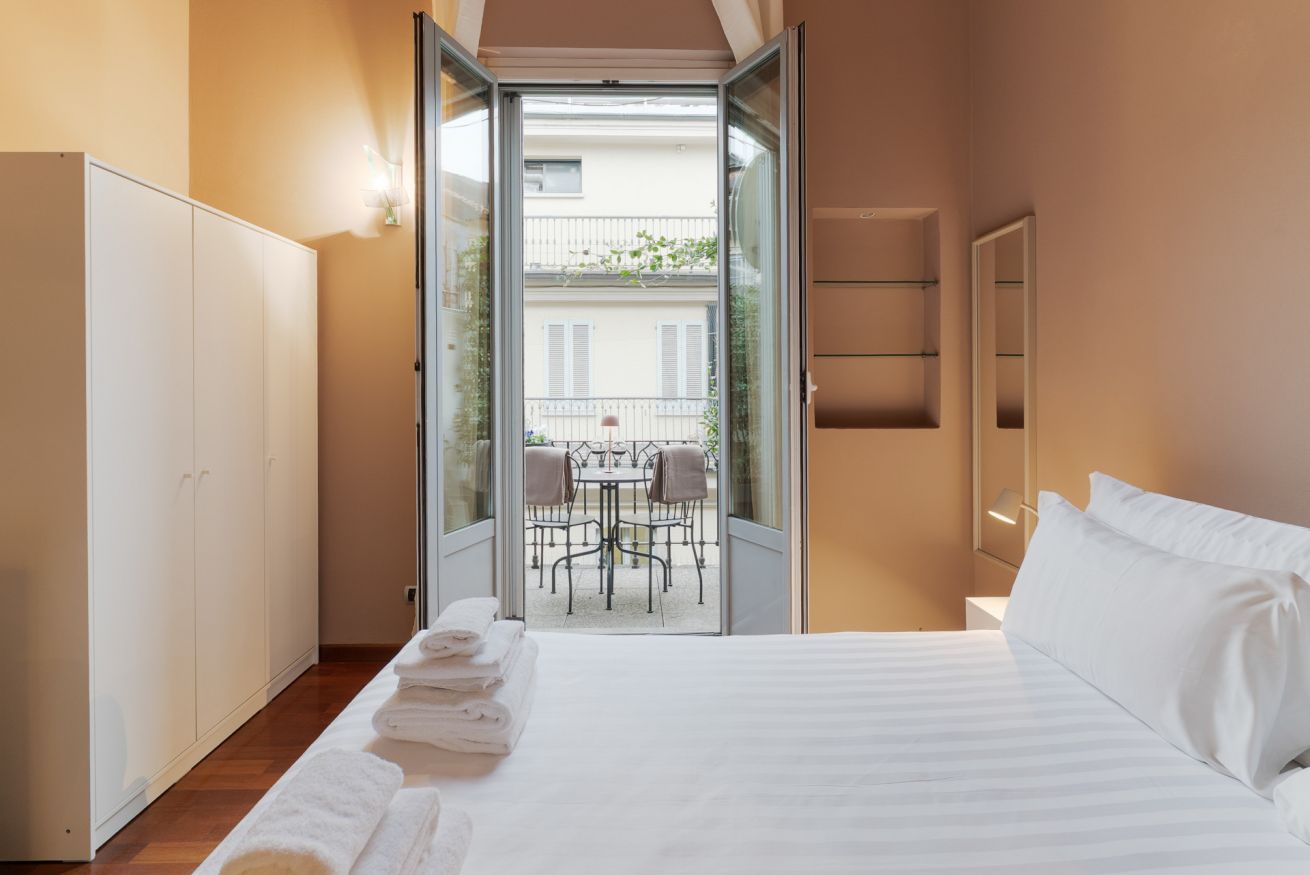 L’appartamento offre un soggiorno con cucina a vista e una camera da letto con balconcino, ideale per un momento di relax nel cuore della città.